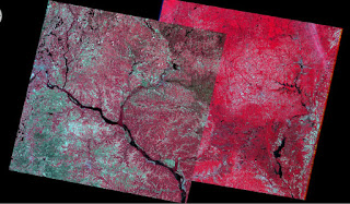 Image Fusion is used to create a high spatial resolution image from a poorer quality image to enhance the visual interpretation of the spatial resolution in the outputted image. The input reflective image is different from the pansharpened image based on color and contrast. The pansharpened image I created has more saturated color and more contrasting colors than the brighter original reflective image. The reflective image shows the river and water bodies as a deep blue and the multispectral image shows the same features but dark black. The trees are easier to see in the multispectral image. The texture of the trees in the deeper red color are easier to see when the contrast is as high as it is in the newer image. There is evidence of a stair-step effect on linear features.