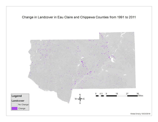 The areas of change over the 20- year period contain mostly cropland or were agriculturally altered over time. (Figure 7) The change in urban areas is a lot less evident compared to the areas highlighted out in ‘the middle of nowhere’. My interpretation of this is that the scale of which change occurs in rural areas a lot more consolidated and covers larger swaths of land than for instance, a new small housing development in town or small park.